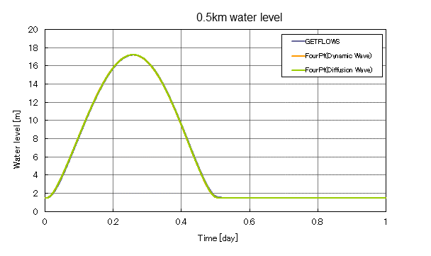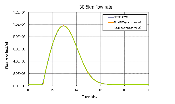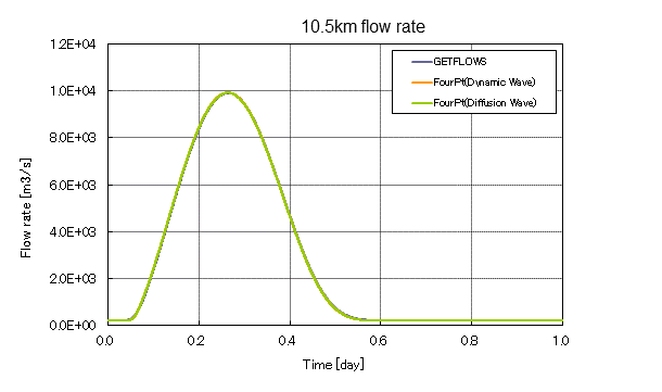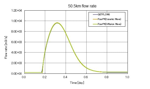 This test case is a benchmark calculation of FourPT code which is developed by USGS. One dimensional open channel flow is simulated for assigned upstream boundary condition. As shown in Figure 4, open channel length is 100,000 [m]. Width is 100 [m] and the channel slope is 0.001 [-]. For upstream end, Pete’s Hydrograph is assigned to provide required boundary condition. In FourPT, Dynamic Wave and Diffusion Wave concept are used for the surface flow calculation. In GETFLOWS, Linearized Diffusion Wave concept is used. Simulation results of GETFLOWS were compared with the FourPT results obtained from both Dynamic Wave and Diffusion Wave analysis.